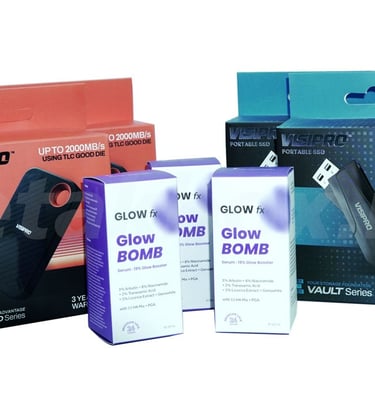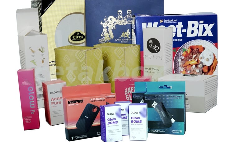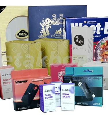 Packaging softbox adalah kemasan ringan dan fleksibel yang terbuat dari bahan karton/kertas, sering digunakan untuk produk makanan, kosmetik, dan aksesoris. Spesifikasi umumnya menggunakan bahan Ivory 250-300 gsm, Dupleks, atau Kraft dengan finishing laminasi doff/glossy, metalize, poly/hot print dan spot UV/spot sand untuk tampilan premium