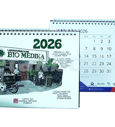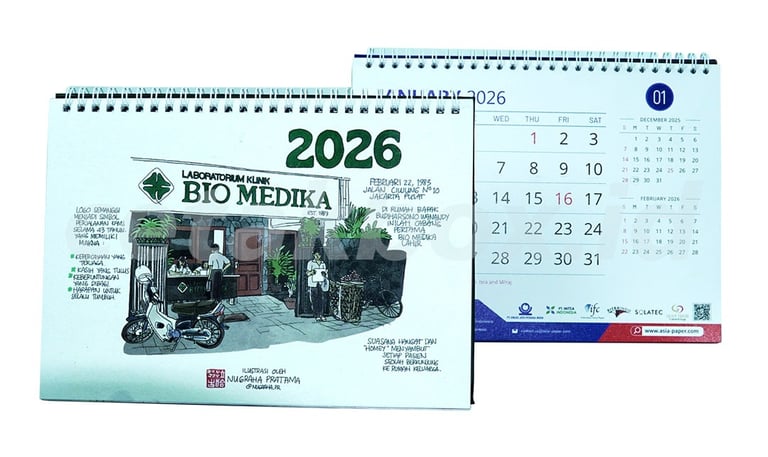 Kalender umumnya meliputi jenis meja (A5, A6) atau dinding (A3+, 31x47cm, 70x50cm) dengan material utama Art Paper 150-230gr, Art Carton 210-260gr, atau Ivory. Finishing menggunakan spiral, jilid tengah, atau klep seng, dengan opsi cetak 7 atau 13 lembar (7-14 halaman)