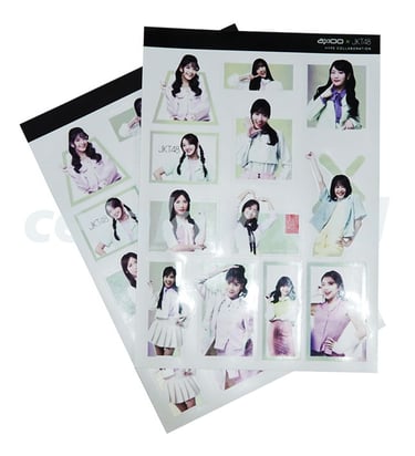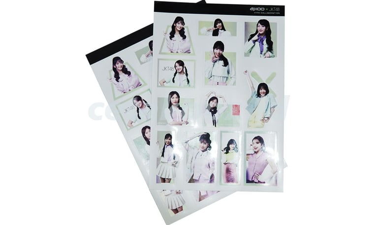 Sticker terdiri dari bahan HVS, cromo dan Vinyl dengan permukaan glossy, matte, dan transparan, penambahan material design dapat menggunakan pilihan hot print atau poly, spot UV, sablon dan print UV sesuai dengan kebutuhannya
