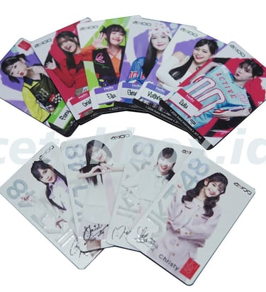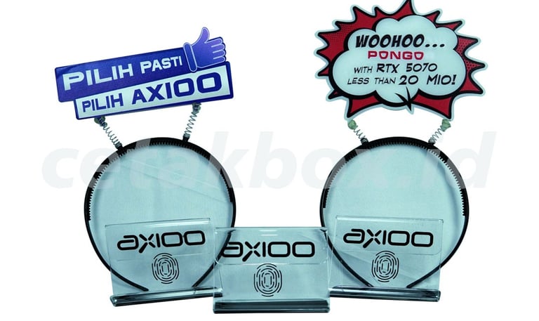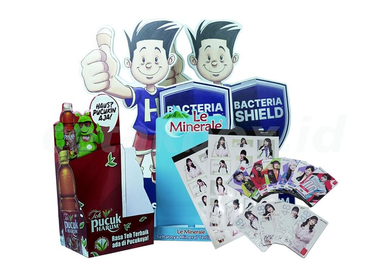 Merchandise akrilik umumnya menggunakan bahan PMMA (polimetil metakrilat) transparan atau berwarna dengan ketebalan standar 2mm hingga 5mm, menawarkan ketahanan tinggi, ringan, dan hasil cetak full color. Ukuran sangat customizable dengan teknik cutting presisi, cocok untuk gantungan kunci, display, bando promotion, maupun souvenir