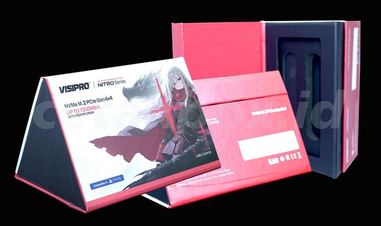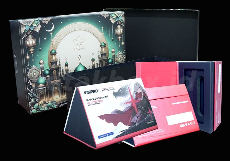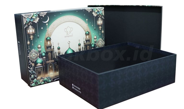 Hardbox lux (mewah) umumnya menggunakan karton tebal berkualitas tinggi (board 2-3 mm) dengan pelapis premium seperti kertas fancy, linen atau beludru. Spesifikasinya mencakup kustomisasi finishing mewah (hot stamp foil, embos, spot UV) dan magnetik, ideal untuk kotak hampers, perhiasan, atau gift box eksklusif