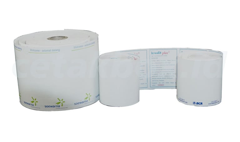 Kertas struk kasir umumnya berjenis thermal (termo-sensitif) yang halus dan tidak memerlukan tinta, dengan ukuran standar 58 mm (portabel/mini) atau 80 mm (supermarket/SPBU). Panjang gulungan (diameter) bervariasi dari 30mm hingga 80mm